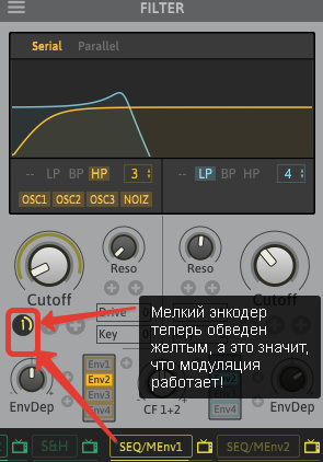 Итак, ниже ещё один рисунок, на котором видна мелкая желтая обводка вокруг бывшего плюса-энкодера - данная обводка как раз означает то, что модуляция начала работать, т.е. биполярная секвенция, которую мы ранее запрограммили через телевизор, начала модулировать Cutoff (кстати, обратите внимание на то, что Cutoff также стал жёлтым!):
